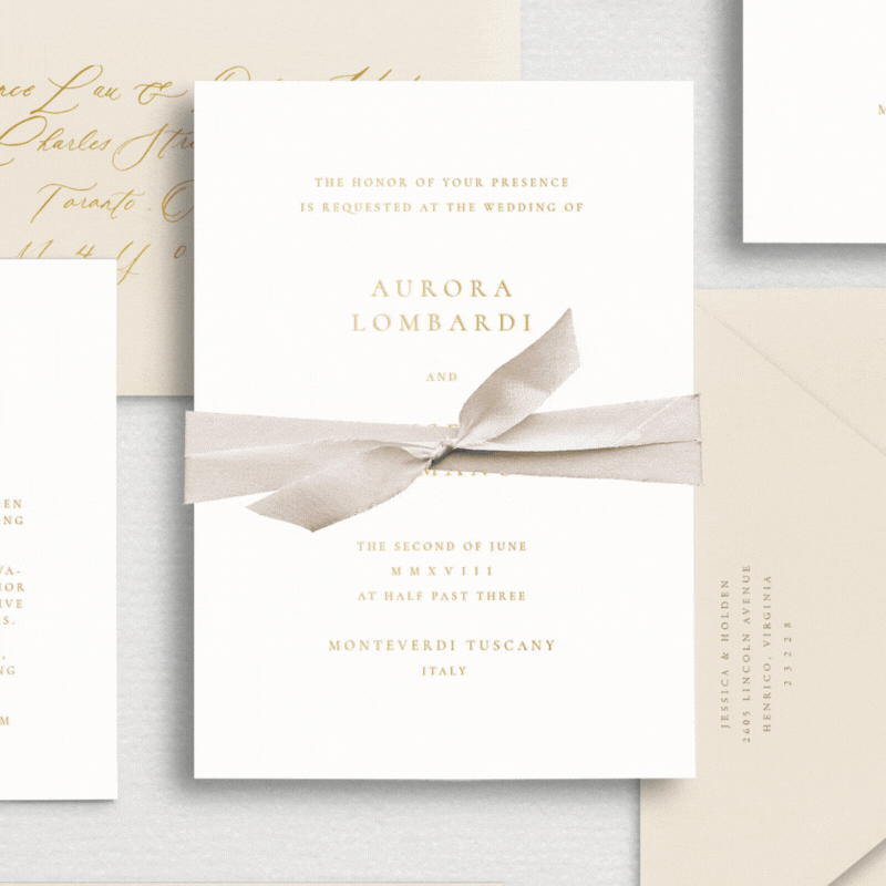 Our Signature suite is inspired by timeless and classic love. With your names and venue name front and center in calligraphy, this suite embodies understated elegance. It can be kept simple with fresh, crisp white stationery or unique and tailored with different colored envelopes and embellishments.